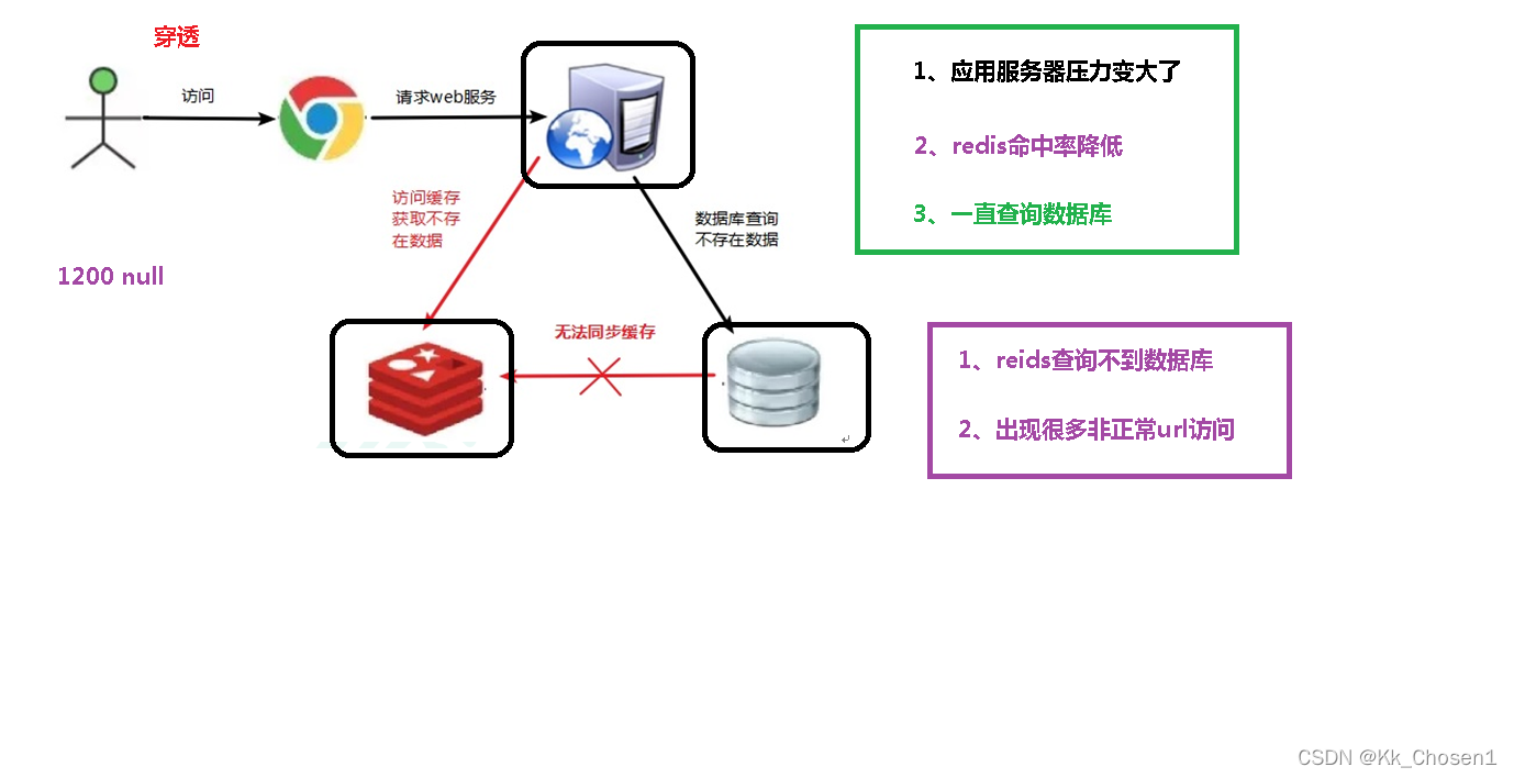 key对应的数据在数据源并不存在,每次针对此key的请求从缓存获取不到,请求都会压到数据源,从而可能压垮数据源。比如用一个不存在的用户id获取用户信息,不论缓存还是数据库都没有,若黑客利用此漏洞进行攻击可能压垮数据库。