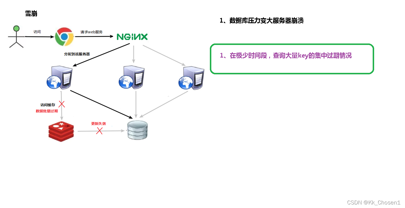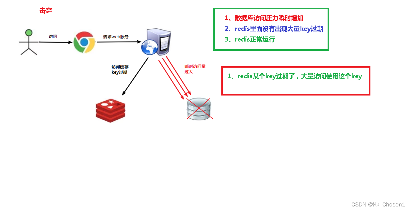 key对应的数据存在,但在redis中过期,此时若有大量并发请求过来,这些请求发现缓存过期一般都会从后端DB加载数据并回设到缓存,这个时候大并发的请求可能会瞬间把后端DB压垮。