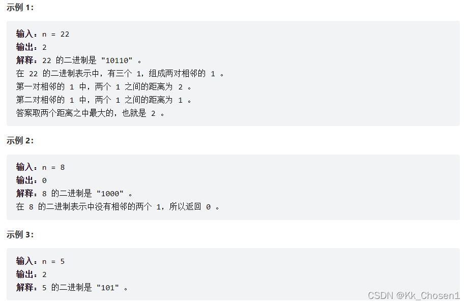 给定一个正整数 n,找到并返回 n 的二进制表示中两个 相邻 1 之间的 最长距离 。如果不存在两个相邻的 1,返回 0 。