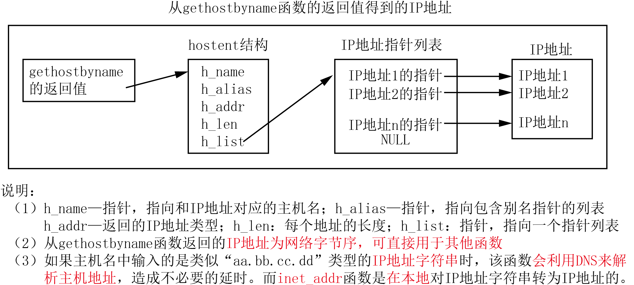 返回值——指向WinSock内部缓冲区一个HOSTENT结构体的指针。(因为一个主机名可能对应多个IP地址) | |