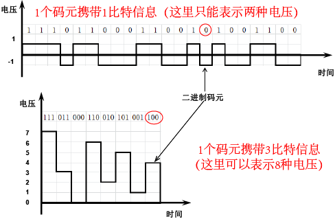 ②一个码元可以用表示一个或多个二进制位数。当一个码元承载越多位的二进制数时,即表示其能承载更多的信息。