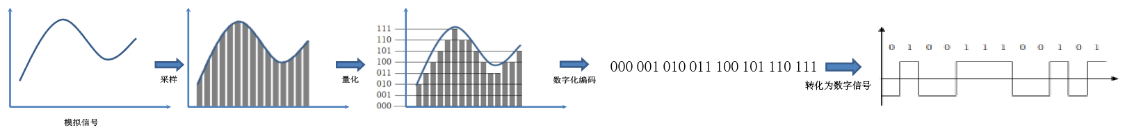 (3)模拟信号转换成数字信号:模拟信号通过脉码调制(Pulse Code Modulation, PCM)方法量化为数字信号。