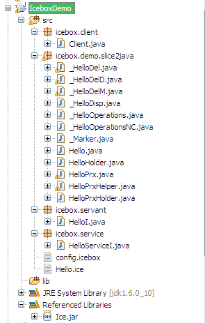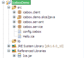 在myeclipse中创建一个java工程IceboxDemo,在工程下创建包icebox.client(存放客户端文件)、icebox.demo.slice2java(存放由slice2java命令编译生成的文件)、icebox.servant(存放servant文件)、icebox.service(存放服务)