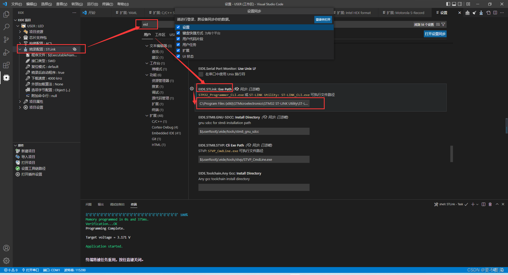 3、输入【eid】--选择【Embedded IDE】找到STLINK的路径设置