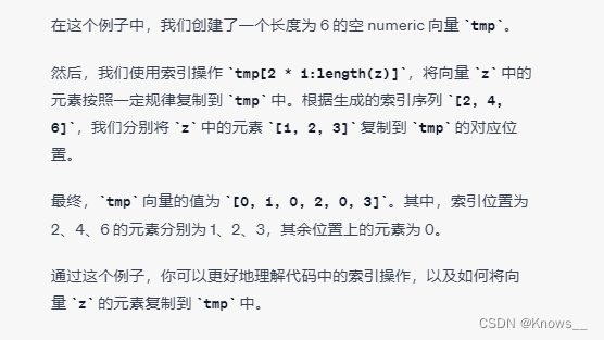 tmp[2 * 1:length(z)] <- z # 将向量 z 中的元素按照一定规律复制到 tmp 中,