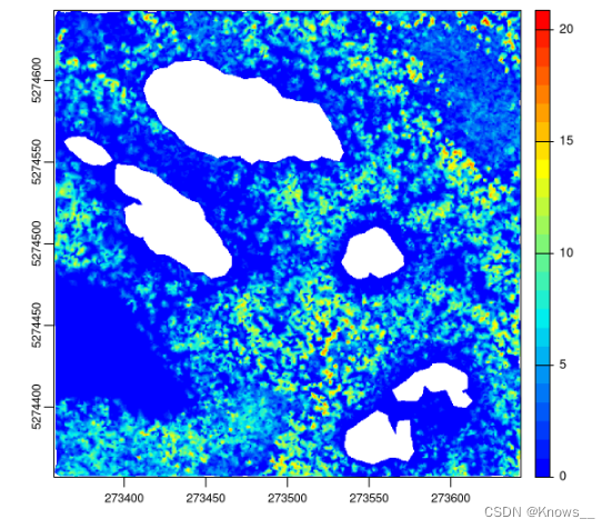 chm_p2r_1 <- rasterize_canopy(las, 1, p2r(subcircle = 0.2), pkg = "terra")