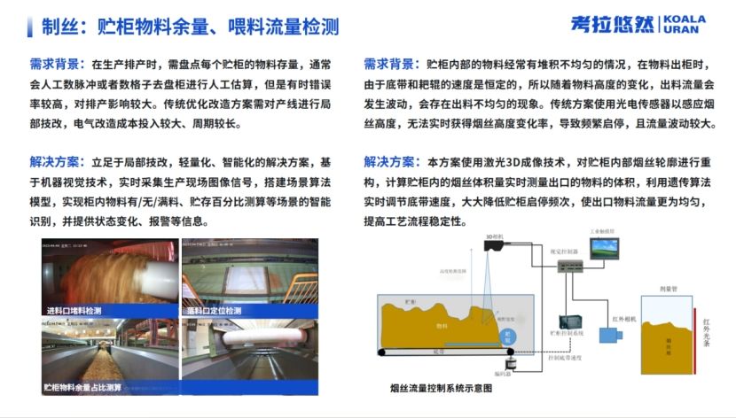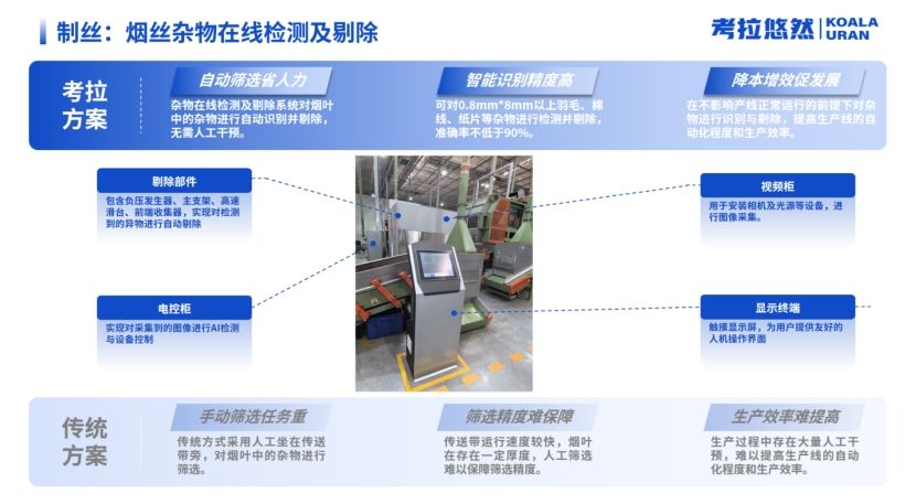 嘿嘿,烟草制丝车间的朋友们,是不是还在为那些小麻烦头疼呢?堵料、断料、物料不够用,喂料流量像过山车一样不稳定,还有那些掺配加香的小插曲,开包工序时不时的“小惊喜”——异物、虫烟、霉烟,还有烟丝里那些不请自来的“小客人”杂物。别急,考拉悠然科技带来的AI小助手,要让这些问题统统变成过去式!
