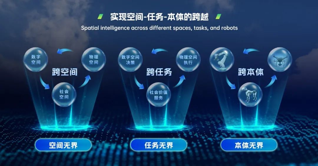 悠然无界大模型之所以能“无界”,在于其打破了空间、任务与本体的固有边界:它能够同时感知和理解数字空间、物理空间与社会空间,实现空间上的无缝联通;具备跨模态的泛化能力和通用性,支持感知、决策、控制等多种任务的统一处理,实现任务上的通用适配;同时具备强大的抽象与迁移能力,能够跨越不同智能体与系统架构之间的差异,实现本体上的协同与共享。三重维度的融合突破,使悠然无界大模型成为构建泛在智能的核心基础。