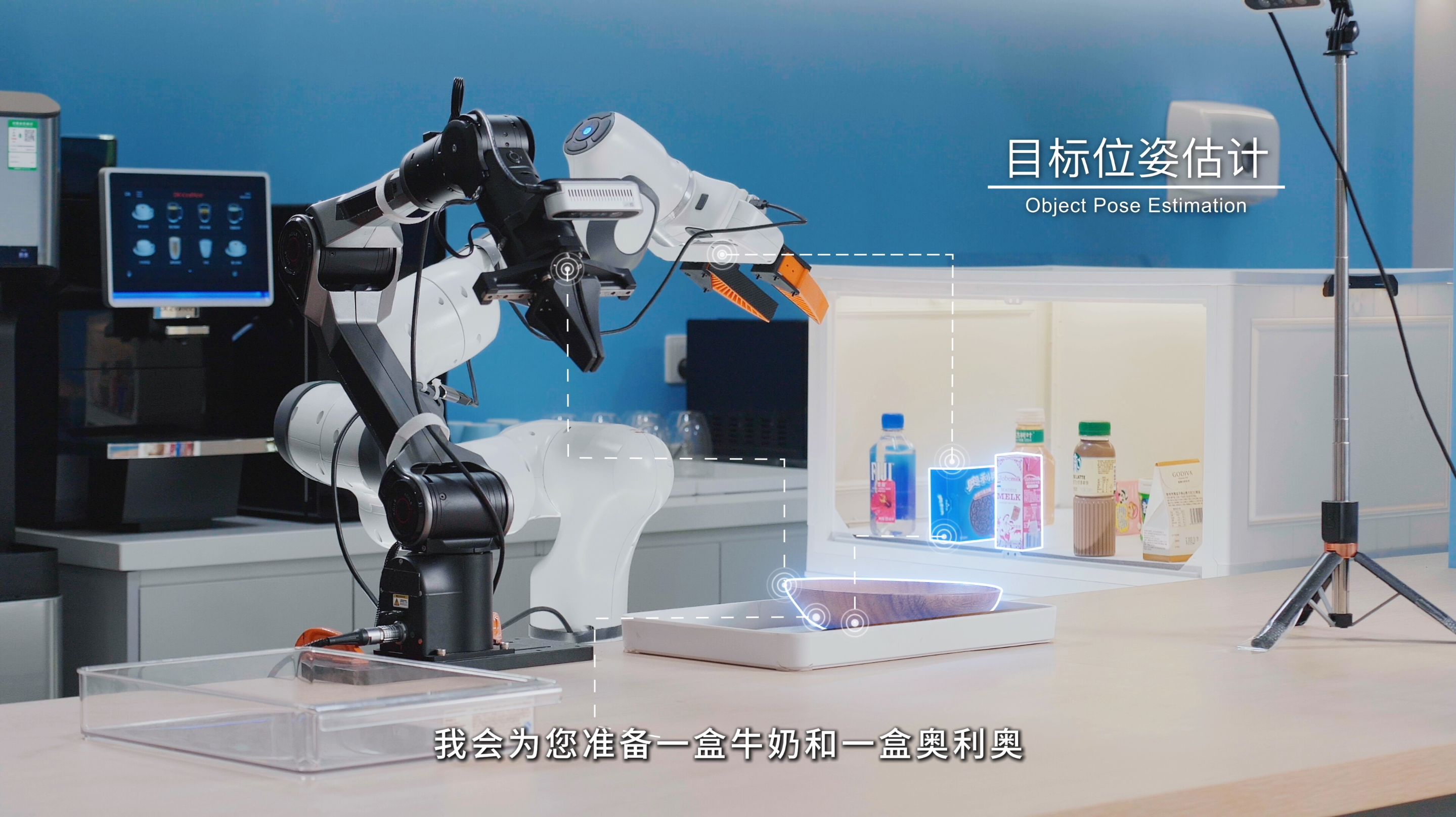 在协作点餐场景中,货架机械臂基于空间感知,识别商品货架中的目标饮料与零食,通过动态路径规划,精准取货并避障送至出餐区;吧台机械臂同步启动,依托多视角协同感知,完成餐盘的精准抓取与摆放。
