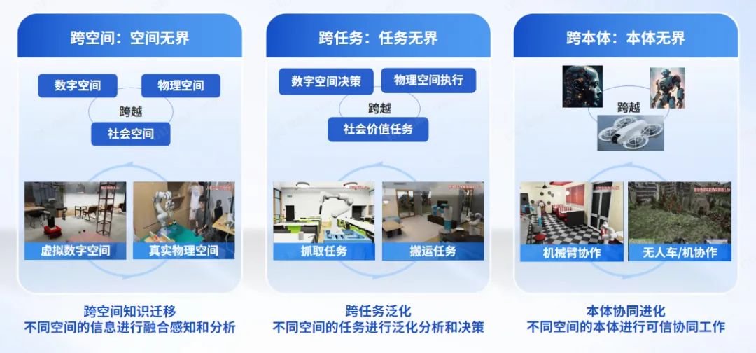 它采用数据驱动、知识引导与物理约束三元融合的创新技术架构,突破了传统大模型在空间感知能力不足、任务适应性有限、多体协同能力弱等局限,重塑了人工智能从感知到理解、从表征到行动、从个体到群体生态的进化路径。