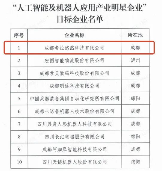 此次入选四川省首批“人工智能及机器人应用产业明星企业”,是对考拉悠然在技术创新、产业落地、市场拓展等多方面卓越表现的高度认可。