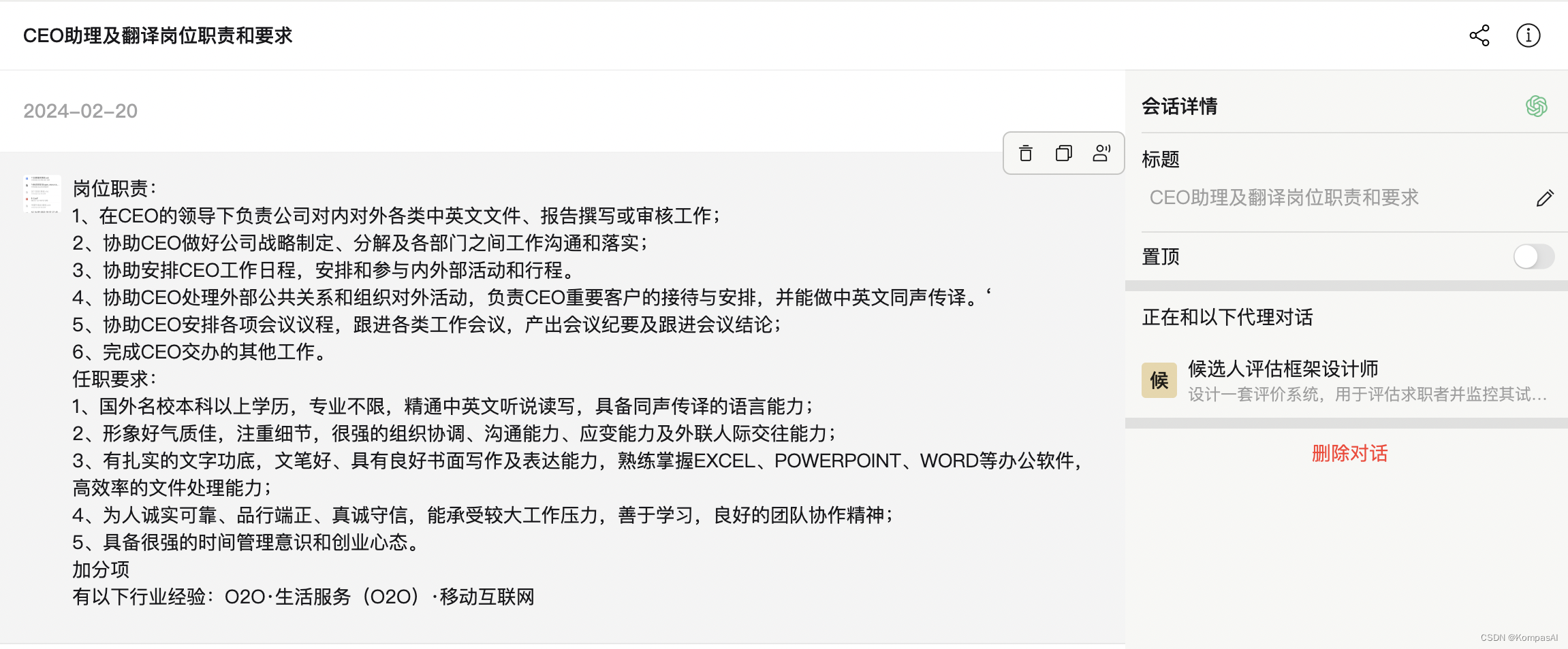 在简历筛选阶段,生成式人工智能可以分析岗位的工作描述,识别出重要的资格要求和责任,并将它们转化为具体的评分标准。例如,CEO助理岗位,评分标准可能包括行政管理能力、组织协调能力、领导力等方面。生成式人工智能还可以根据候选人简历中的关键词和经历,评估其与岗位要求的匹配度,从而帮助人力资源部门快速筛选出符合条件的候选人。