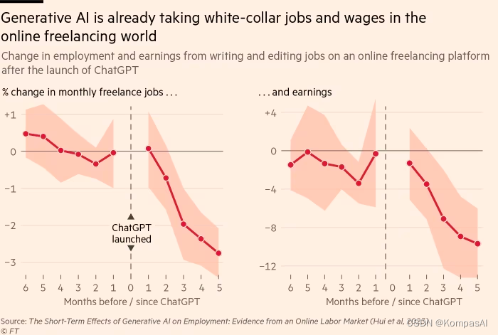 最近的研究发现,自ChatGPT和Midjourney推出以来,主要在线自由职业平台上的文案和平面设计师的工作量和收入都显著下降。这说明生成式人工智能产品正在与人类创作的作品竞争,直接影响到他们的工作。