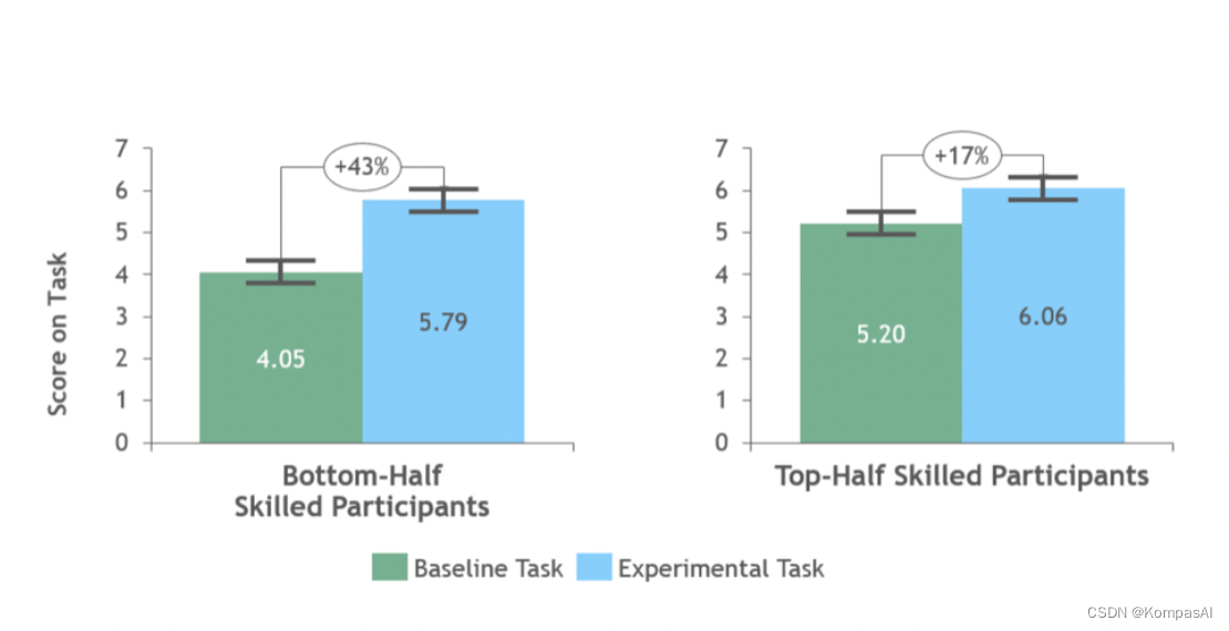 这项研究还发现,在使用人工智能工具后,绩效排名后50%的用户表现提高了43%,而排名靠前的用户提高了17%。这意味着所有员工,无论技能水平如何,都能从人工智能的使用中获益,尤其是之前表现较差的员工。这些结果表明,人工智能可以缩小人们在执行任务能力上的差距,提高组织中每个人的整体工作质量。