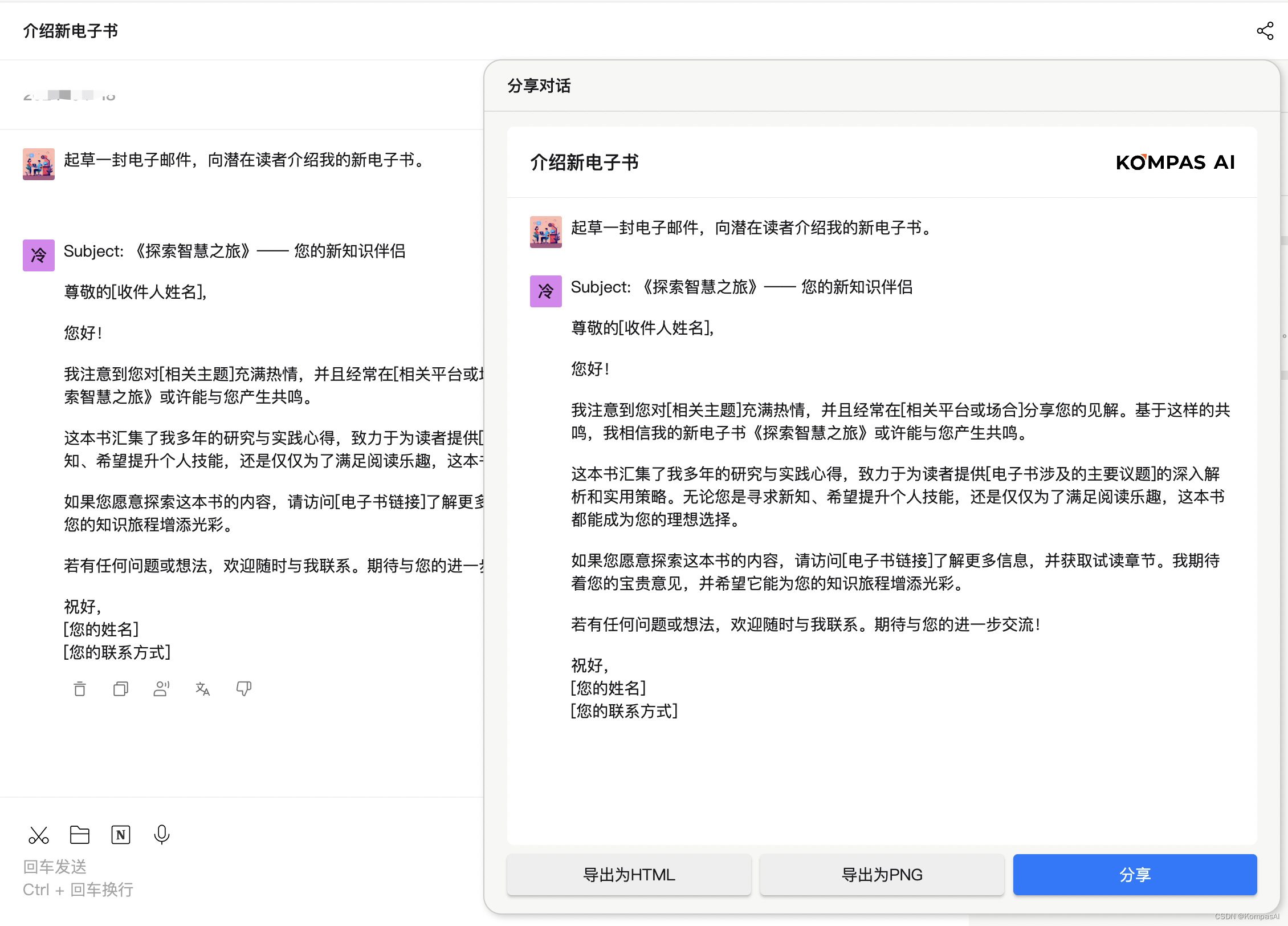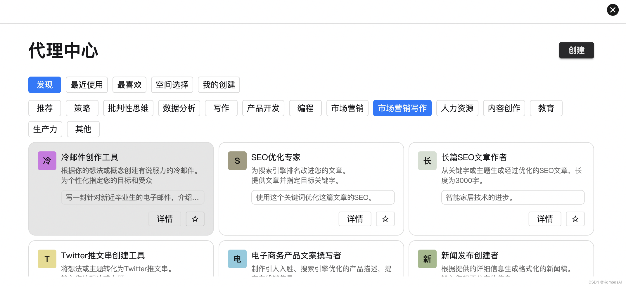 通过下载Kompas AI,只需打开首页,点击左侧的新聊天,即可在代理中心找到“冷邮件创作工具”这一功能,一键启动即可使用,在对话框输入内容,帮您完成大量的工作,让您的时间更加自由。