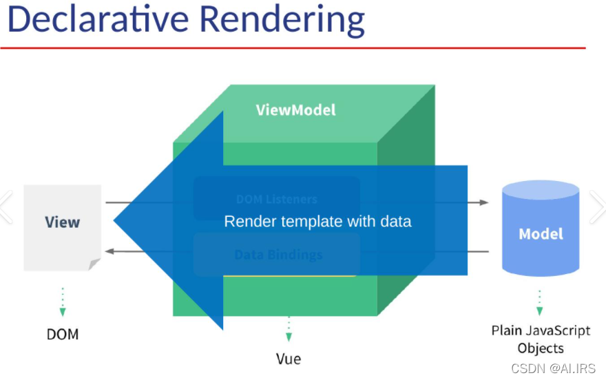 Mounted Virtual DOM re-render and patch : 根据新数据,生成新的虚拟DOM,随后与旧的虚拟DOM进行比较,最终完成页面的更新,即 完成了Model→View的更新