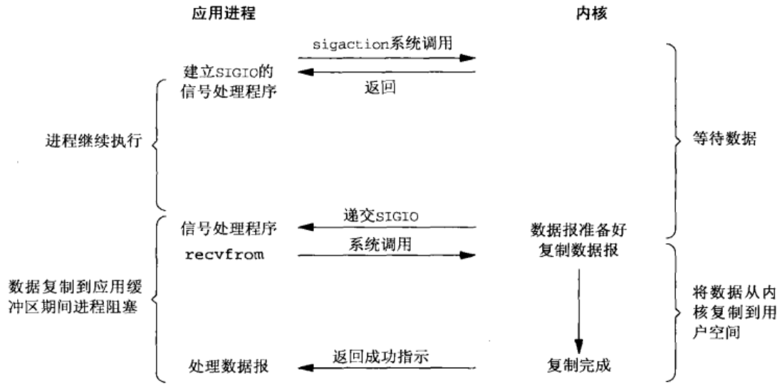 首先通过sigaction系统调用启用信号驱动功能并设置信号处理函数,该调用会立即返回,不会阻塞当前进程。当数据报就绪时,内核会向进程发送SIGIO信号。此时可以选择两种处理方式:一是在信号处理函数中直接调用recvfrom读取数据,然后通知主程序进行后续处理;二是简单地通知主程序有数据可读。这种模式的主要优点是避免了进程在等待数据时的阻塞,主程序可以持续运行,只需等待信号处理程序的通知即可,无论是数据已准备好处理还是数据报已就绪可读。