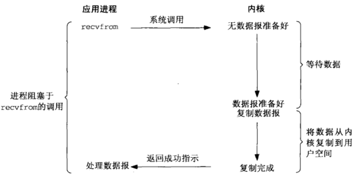 进程调用 recvfrom 会发起系统调用,阻塞等待内核将数据准备好并返回。直到数据被复制到应用缓冲区或者发生错误的时候才会返回。最常见的错误就是系统调用被信号中断。