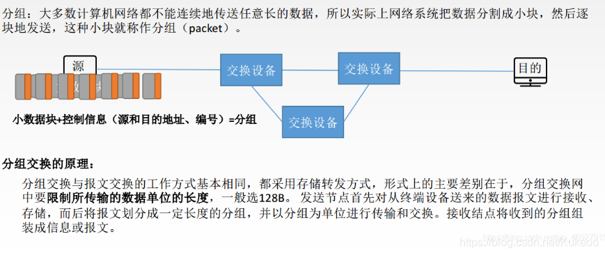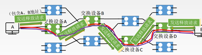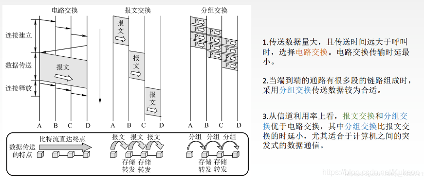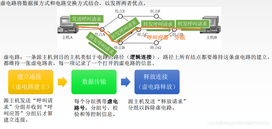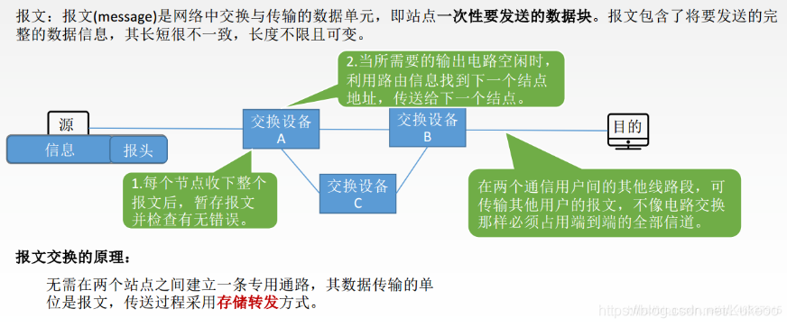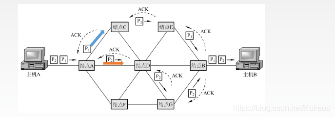 2.A收到分组后,对每个分组进行差错检测和路由选择,不同分组的下一条结点可能不同。