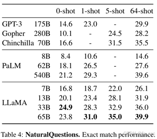 在LLaMA提出时进行测试中,发现模型规模足够大时,k-shot可以更好的进行模型生成,在相同LLaMA 65b模型下,64-shot表现准确度为39.9,但是0-shot表现准确度只有23.8。