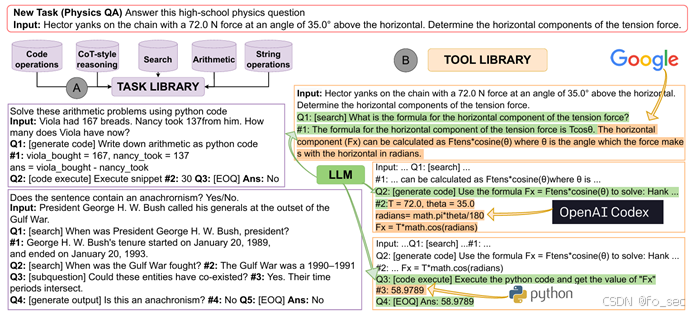 由于Auto-CoT存在,任务可以拆分为多个步骤组合成Task library,在此基础上引入Tool library,在不同任务时可以调用相关工具进行进一步运算。例如下图:面对问题首先google得出公式,通过OpenAI Codex进行编程,最后调用python进行code运算。