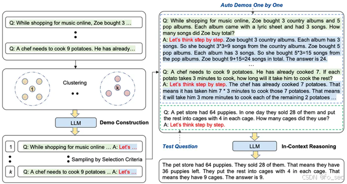2.演示抽样:每组中选择代表性的问题,通过zero-shot-CoT进行生成推理链。