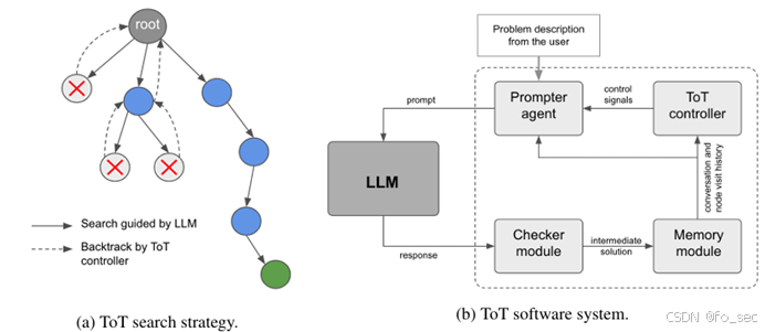 下中通过prompt接入LLM,回答经过checker module进行correctness check,而后经过memory module(存储完整交谈数据)进行ToT controller控制。如果ToT controller认为输出不正确或者无法找到最终解决方案,则返回父节点。