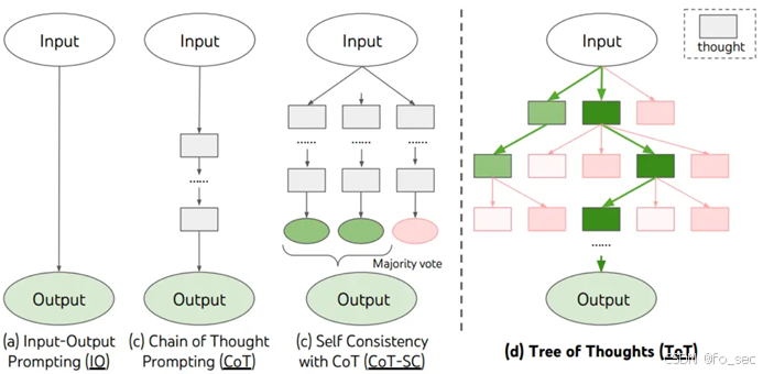 由于传统的思维链等无法准确进行探索或者预判操作,Yao(2023)提出了思维树框架,即基于思维链进行总结,引导语言模型探索把思维链作为中间步骤解决通用问题。目前主流的Yao采用深度优先/广度优先搜索,而Long(2023)提出由强化学习训练ToT控制器驱动树搜索策略。