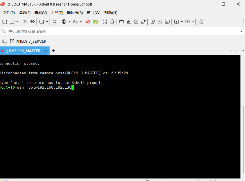 (4)进行SSH远程连接,先在RHEL系统的终端中输入ip address 查看自己的IP地址,随后用XSHELL软件输入以下命令进行远程连接自己的RHEL系统