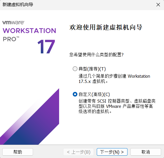 (1)新建虚拟机,选择自定义模式