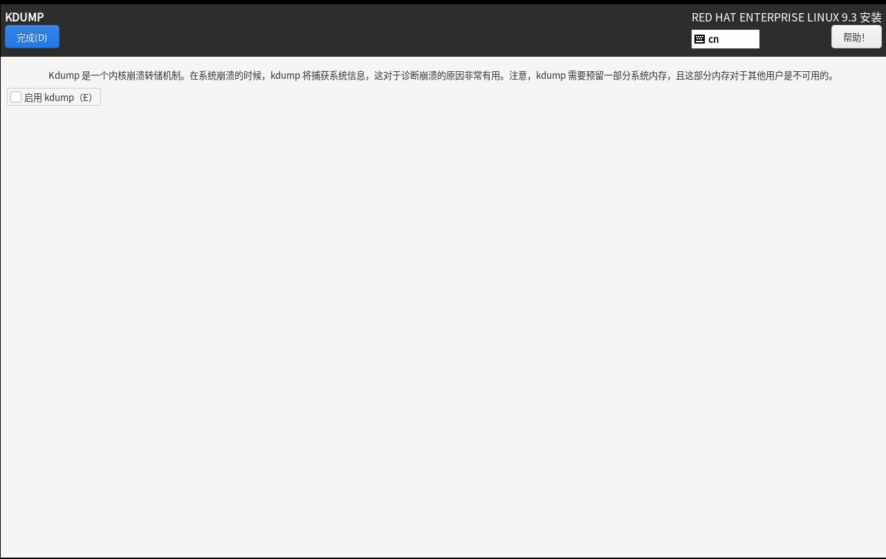 配置完成磁盘后在KDUMP部分关闭KDUMP,因为KDUMP会占用部分内存,但是在企业的RHEL系统中一定要把KDUMP开启