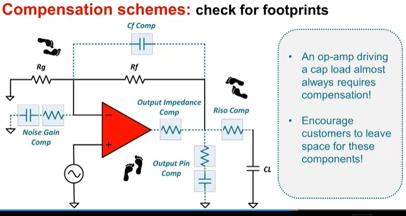 “运放驱动容性负载几乎总是需要补偿”: 容性负载 \(C_L\) 会与运放输出阻抗形成极点,导致相位裕度急剧下降(相位滞后增加),当相位裕度接近 0 时,电路会振荡。因此必须通过补偿调整环路特性,保证稳定性。