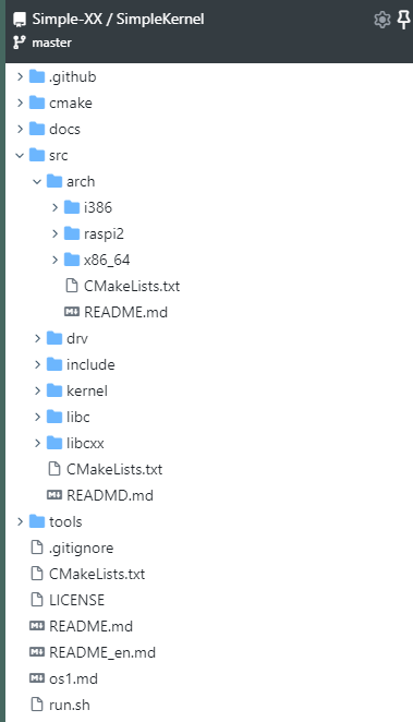 这不,我在github上面,发现还真有一个哥们开源了自己手写的操作系统内核,叫 SimpleKernel ,非常好的地方就是他贴心地提供了各个阶段完成度不同的内核,你可以从自己喜欢的地方开始,而且整个工程按照功能模块划分子目录,每个子目录再划分头文件和源文件目录,架构清晰易懂,如下图: