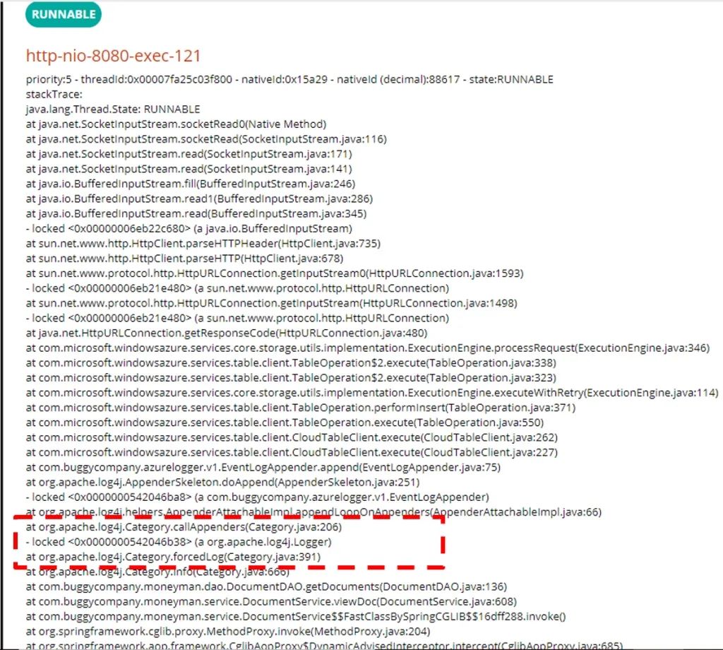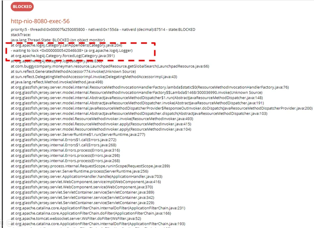 看一下上面堆栈跟踪中被框出来的部分。我们可以看到“http-nio-8080-exec-56”当前正处于阻塞(BLOCKED)状态,而阻塞的原因是它正在等待获取org.apache.log4j.Logger的锁。前面我们刚刚分析过,“http-nio-8080-exec-121”获得了org.apache.log4j.Logger的锁,正在进行其他操作,而锁并没有被释放,所以其他线程想要获得锁就只能被阻塞。其余的所有被阻塞的线程也在等待获取org.apache.log4j.Logger的锁。因此,每当任何应用程序线程试图记录日志时,它都会因为无法获取到锁而进入阻塞状态。