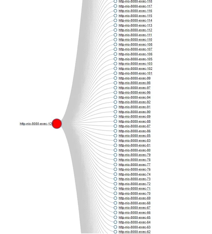 然后我们将捕获的线程Dump上传到一个线上线程Dump分析工具(https://fastthread.io/)。该工具立即帮我们生成了一份报告。报告立即找出了问题的根本原因。分析工具上显示“http-nio-8080-exec-121”线程阻塞了100多个线程。下面是传递依赖图,展示了阻塞线程: