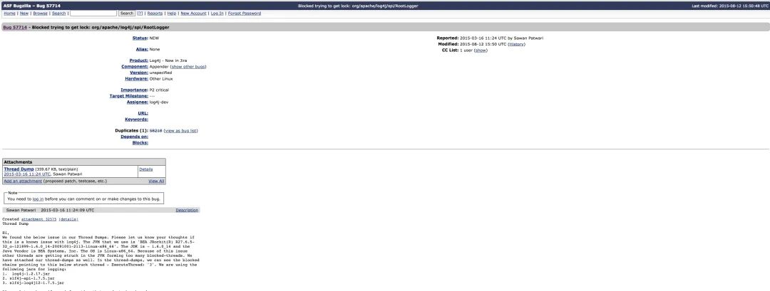 刚开始我们也没有太多的头绪,后来我们尝试借助Google的力量,然后我们用谷歌搜索了"org.apache.log4j.Logger 阻塞 线程"这样的关键字。我们在Apache Log4j bug数据库中偶然发现了这个有趣的Bug,而且这个Bug早在2015年就被发现了。(https://bz.apache.org/bugzilla/show_bug.cgi?id=57714 )。