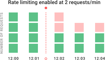 在示例图表中,你可以看到速率限制如何在一段时间内阻塞请求。API最初每分钟接收4个请求,用绿色表示。当12:02启用速率限制时,以红色显示的其他请求将被拒绝。速率限制对于公共API是非常重要的,因为你想要为每个消费者(API调用者)维护良好的服务质量,即使有些用户获取了超出其公平配额的服务。计算密集型的端点特别需要速率限制——特别是通过自动伸缩或AWS Lambda和OpenWhisk等按计算付费服务来提供服务时。你还可能希望对提供敏感数据的API进行评级,因为如果攻击者在某些不可预见的事件中获得访问权限,这可能会限制暴露的数据。实际上有许多不同的方法来实现速率限制,我们将探讨不同速率限制算法的优缺点。我们还将探讨跨集群扩展时出现的问题。最后,我们将向你展示一个如何使用Kong快速设置速率限制的示例,Kong是最流行的开源API网关。