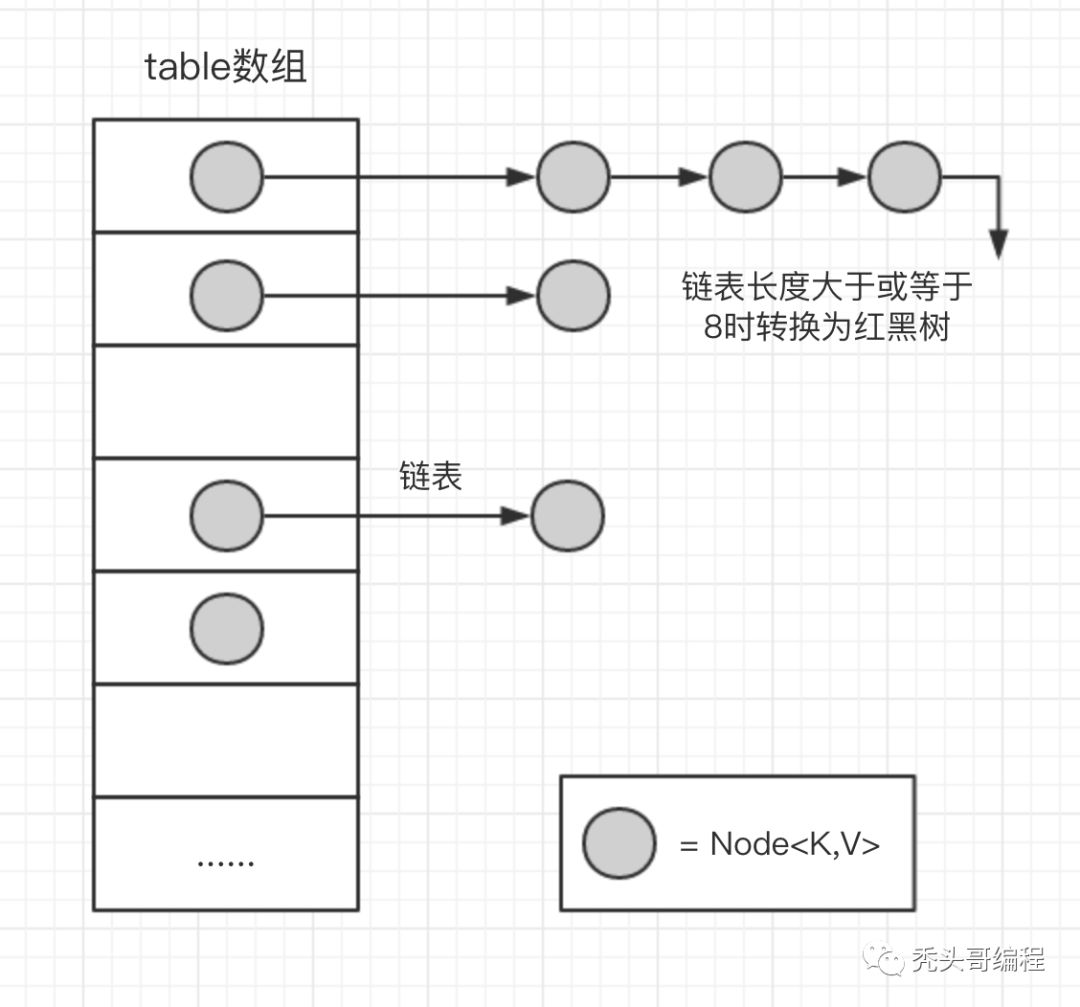 为了解决碰撞,数组中的元素是单向链表类型。当链表长度到达一个阈值时(7或8),会将链表转换成红黑树提高性能。而当链表长度缩小到另一个阈值时(6),又会将红黑树转换回单向链表提高性能,这里是一个平衡点。