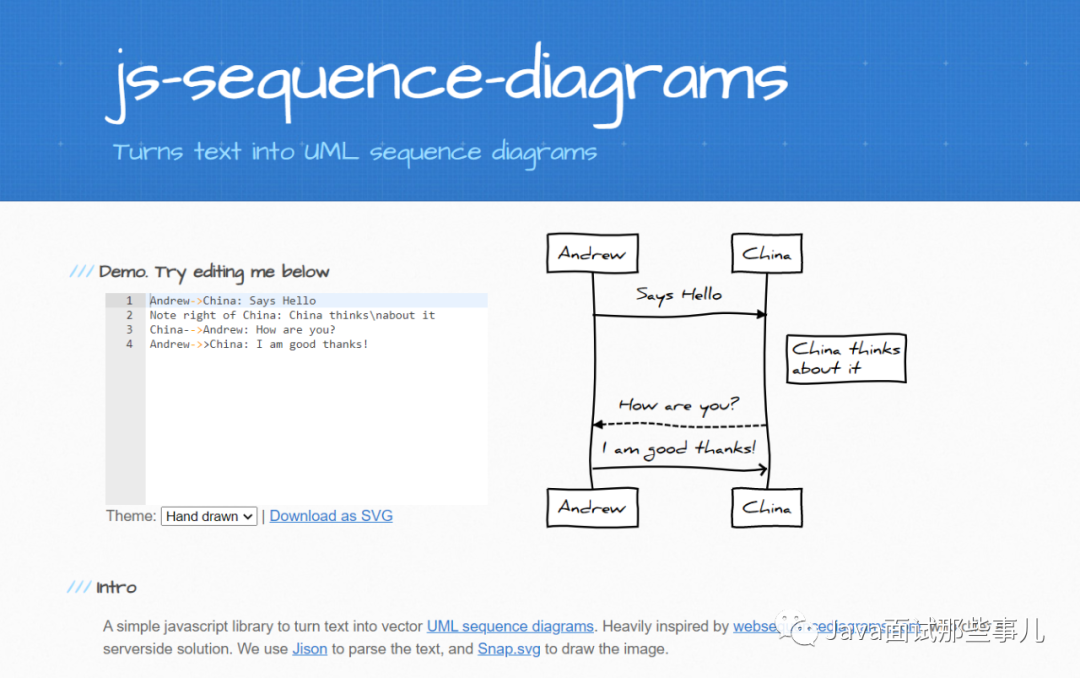 最近,小编逛Github发现一个有趣的开源仓库:Js sequence diagrams ,估计不少同学都能用得上。目前,已有 7.4k star,是一个方便建立UML的时序图(序列图/循序图)在线工具,使用特别简单,纯 JavaScript 打造!