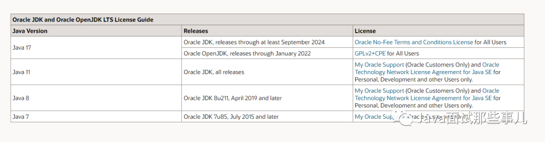 其实,咱们也可以通过通过下图来对比已发布的几款JDK LTS协议,也会发现这次Orcale确实是认真的,见下图: