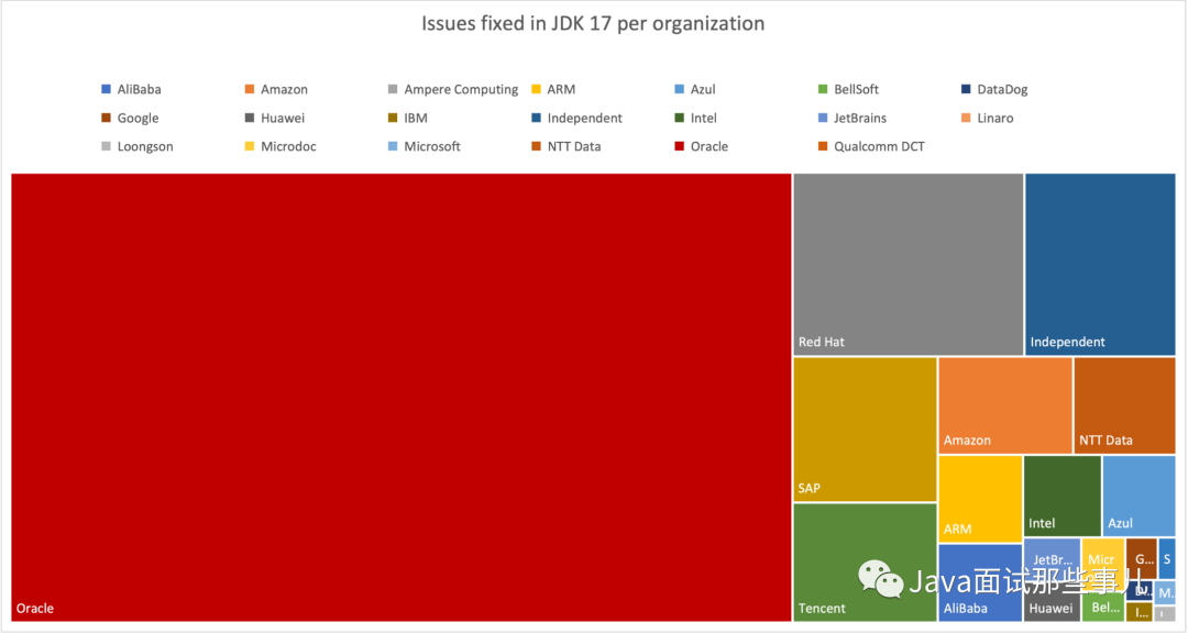 在 Java 17 中,标记为已修复的 2,645 个 JIRA 问题中,1,774 个由 Oracle 完成,而 871 个由 Java 社区的其他成员贡献。在 Java 17 中赞助开发贡献的图表中,见下图: