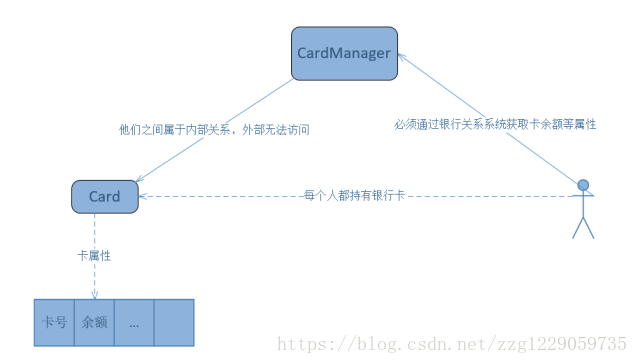 - 每个人获取银行卡余额都必须通过该银行的管理系统。
