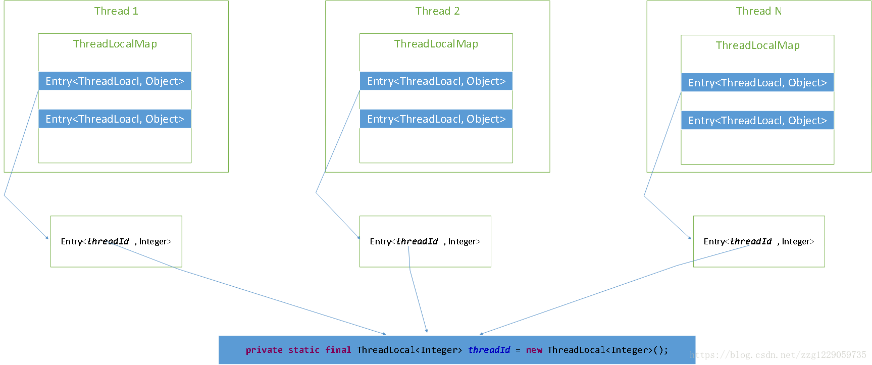 也就是说我们对于ThreadLocal的get, set,remove的操作结果都是针对当前线程Thread实例的threadLocals存,取,删除操作。类似于一个开发者的任务,产品经理左右不了,产品经理只能通过技术leader来给开发者分配任务。下面再举个栗子,进一步说明他们之间的关系:
