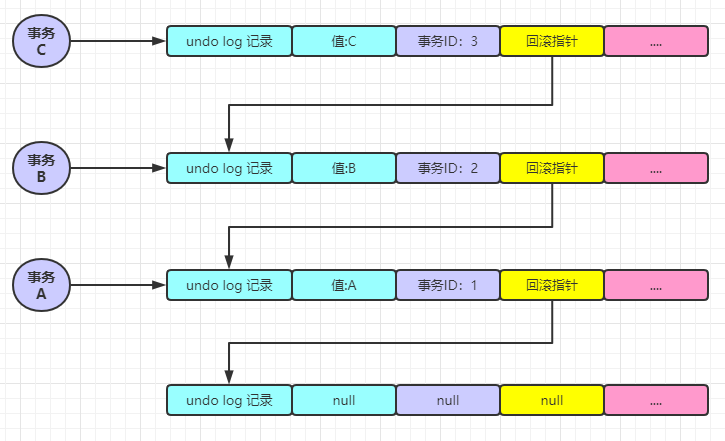 说到这里,我们又要提到一个新的概念了。就是数据在磁盘存储的时候,每一条存储的记录都会有事务 ID 和回滚指针(其他的是什么本文不需要关注,学习抓住脉路即可,否则必定走火入魔)。