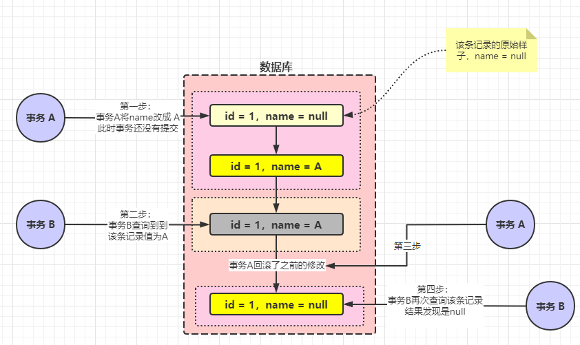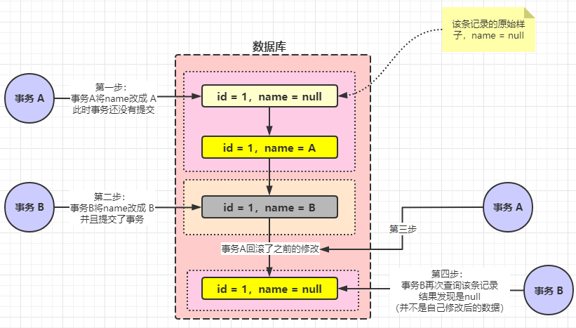 首先来分析一下概念:假设有两个事务 A、B。事务 A 先开启事务,并且修改了一条 id 为 1 的记录,将 name 改成 A(假设原来为 null),但是此时 事务 A 还没有提交。这个时候事务 B 开启了。事务 B 将 id 为 1 的记录中 name 改成了 B,并且将事务提交 了。但是这个时候事务 A 不想修改了,就像之前自己修改的数据回滚了。也就是说此时导致的结果就是 id 为 1 的这条记录的 name 还是为 null。