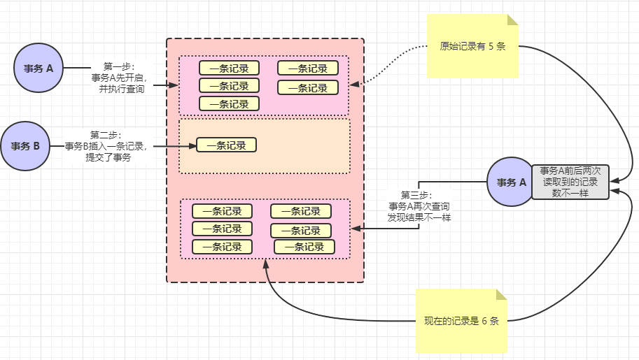 先来分析一下幻读。还是假设有两个事务 A、B。事务 A 先开启了,并执行了这样的 SQL:select * from user,假设现在结果是 5 条,此时事务 B 开启了,并往 user 表中插入了一条记录,并提交了事务,此时事务 A 又执行了 select * from user结果发现是 6 条记录。懵逼了。还以为自己饿昏了眼花了。这就是所谓的幻读。