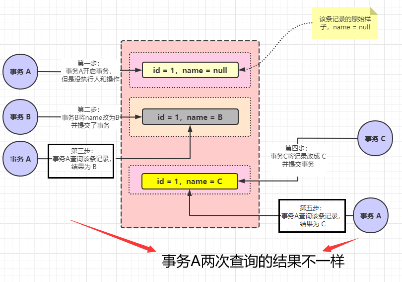 废话少说,直接进分析:假设有三个事务 A、B、C ,事务 A 先开启了,但是还没有执行任何的操作,事务 B 开启了,事务 B 将 id 为 1 的记录的 name 改为 B 并提交了事务,此时事务 A 开始活动了,查询到的这条记录的 name 值为 B,还是还未执行任何操作。此时事务 C 开启了,事务 C 将 id 为 1 的记录的 name 改为 C 并提交了事务。此时事务 A 又开始活动了,结果查询到的 id 为 1 的 name 值又变成了 C。这就是不可重复读