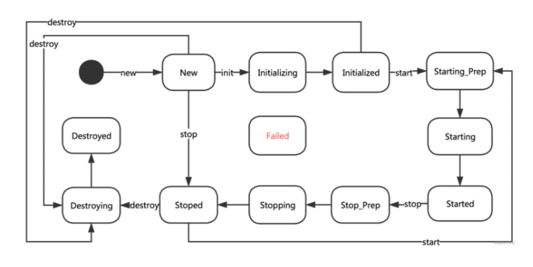 比如执行初始化操作时,会判断当前状态是否 New,如果不是则抛出生命周期异常;是的 话则设置当前状态为 Initializing,并执行 initInternal 方法,由子类实现,方法执行成功则设置当 前状态为 Initialized,执行失败则设置为 Failed 状态;