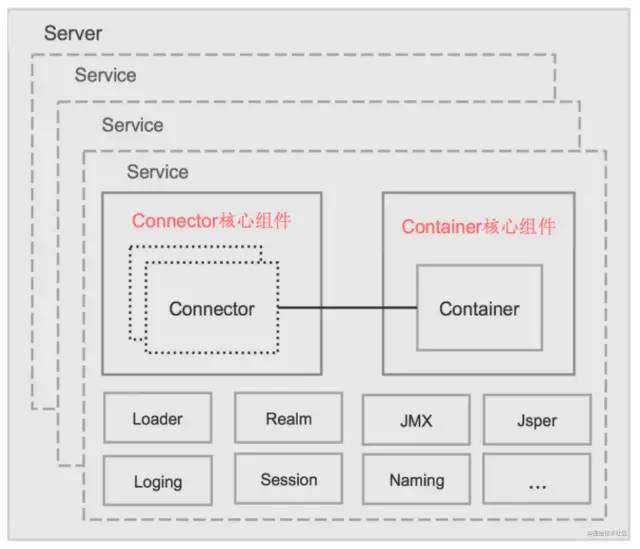 Service:Tomcat 封装的、对外提 供完整的、基于组件的 web 服务, 包含 Connectors、Container 两个 核心组件,以及多个功能组件,各 个 Service 之间是独立的,但是共享 同一 JVM 的资源 ;