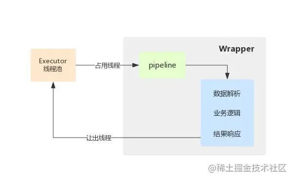 请求到来时建立连接,解析请求参数,创建 Request 和 Response 对象,调用顶层容器 pipeline 的 invoke 方法